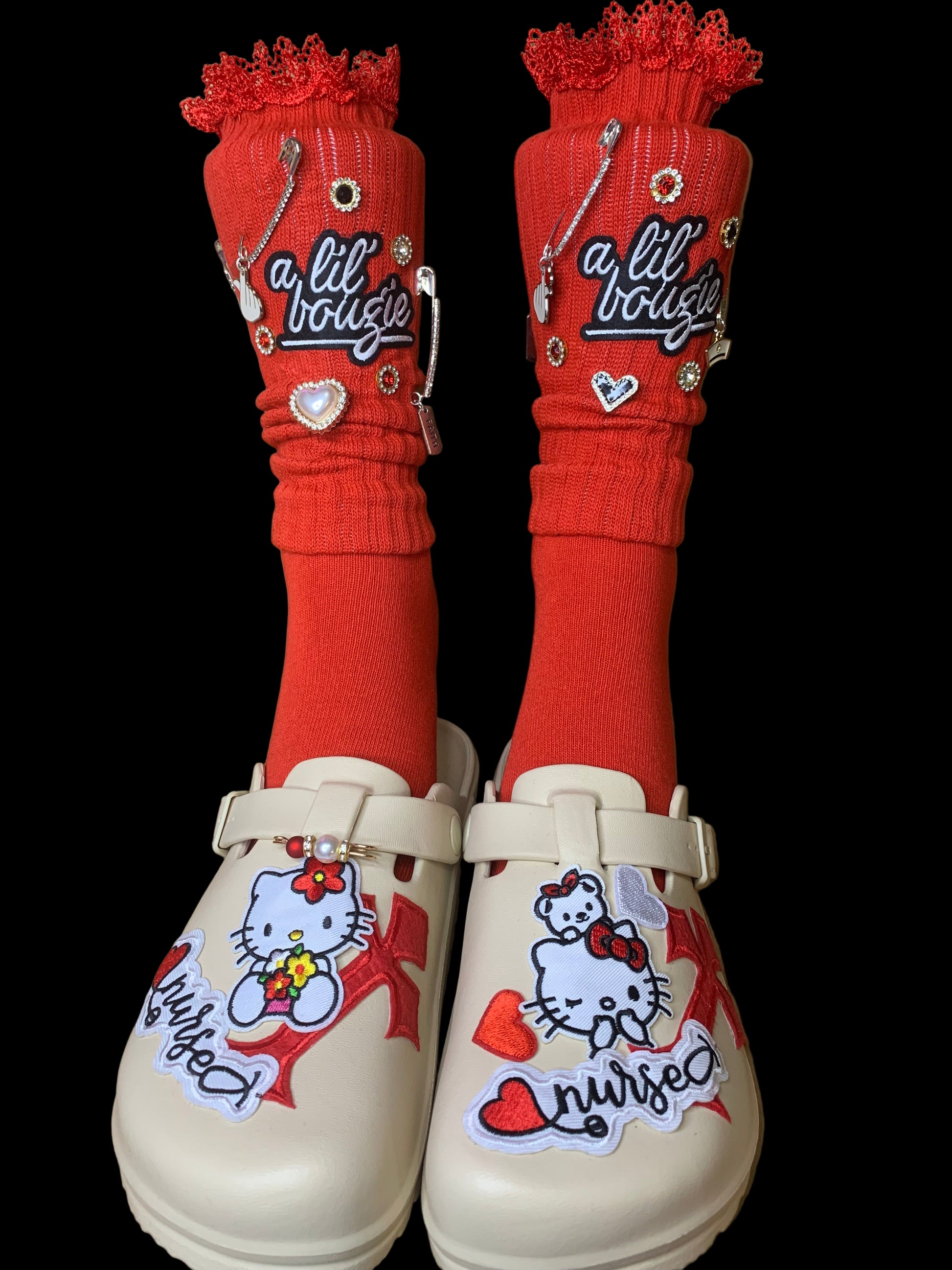 💋This nurse themed set comes with clogs size 9,slouch socks,trucker hat,mini bag with detachable keychain,charm bangles,hoop earrings❤️