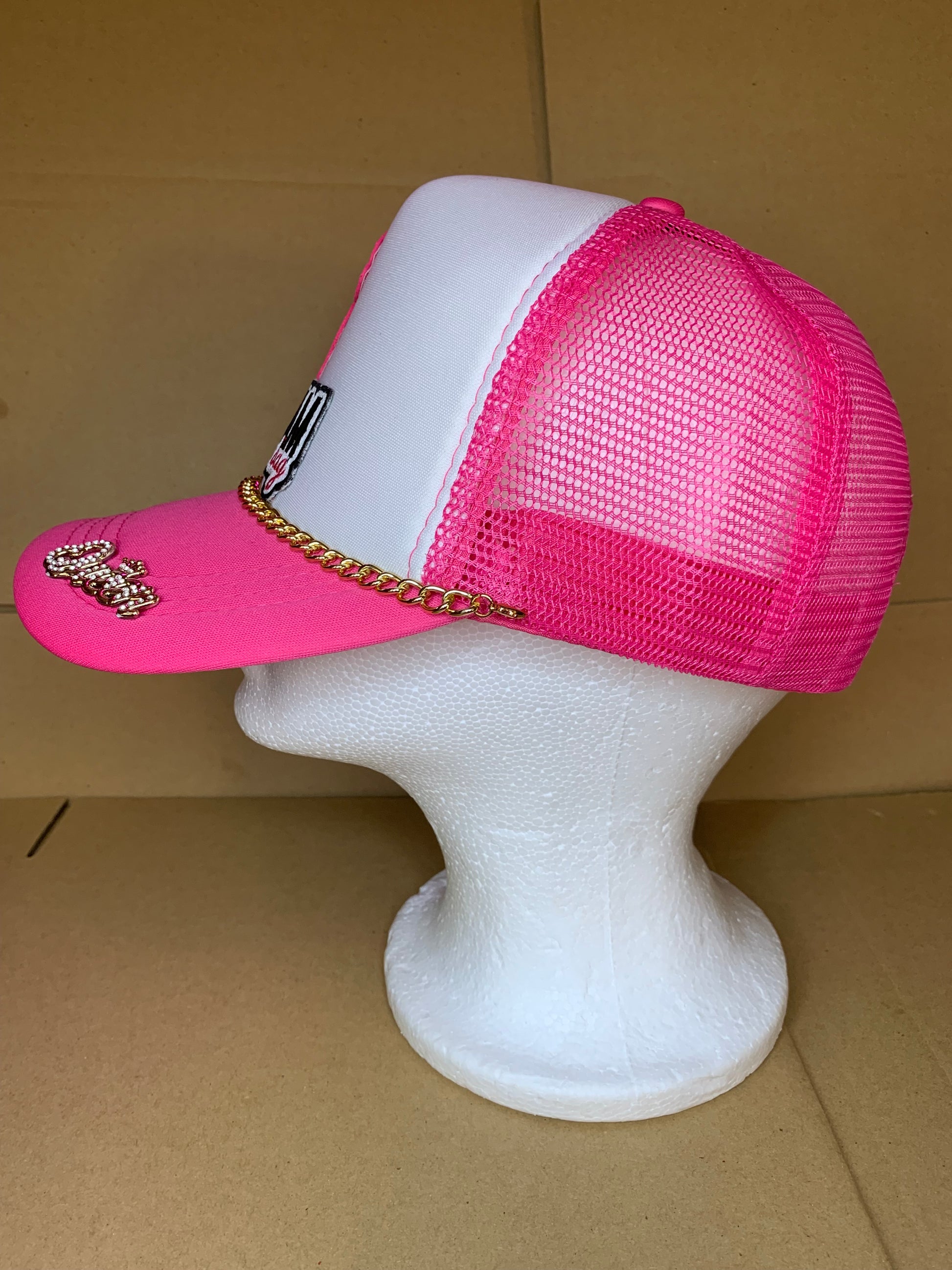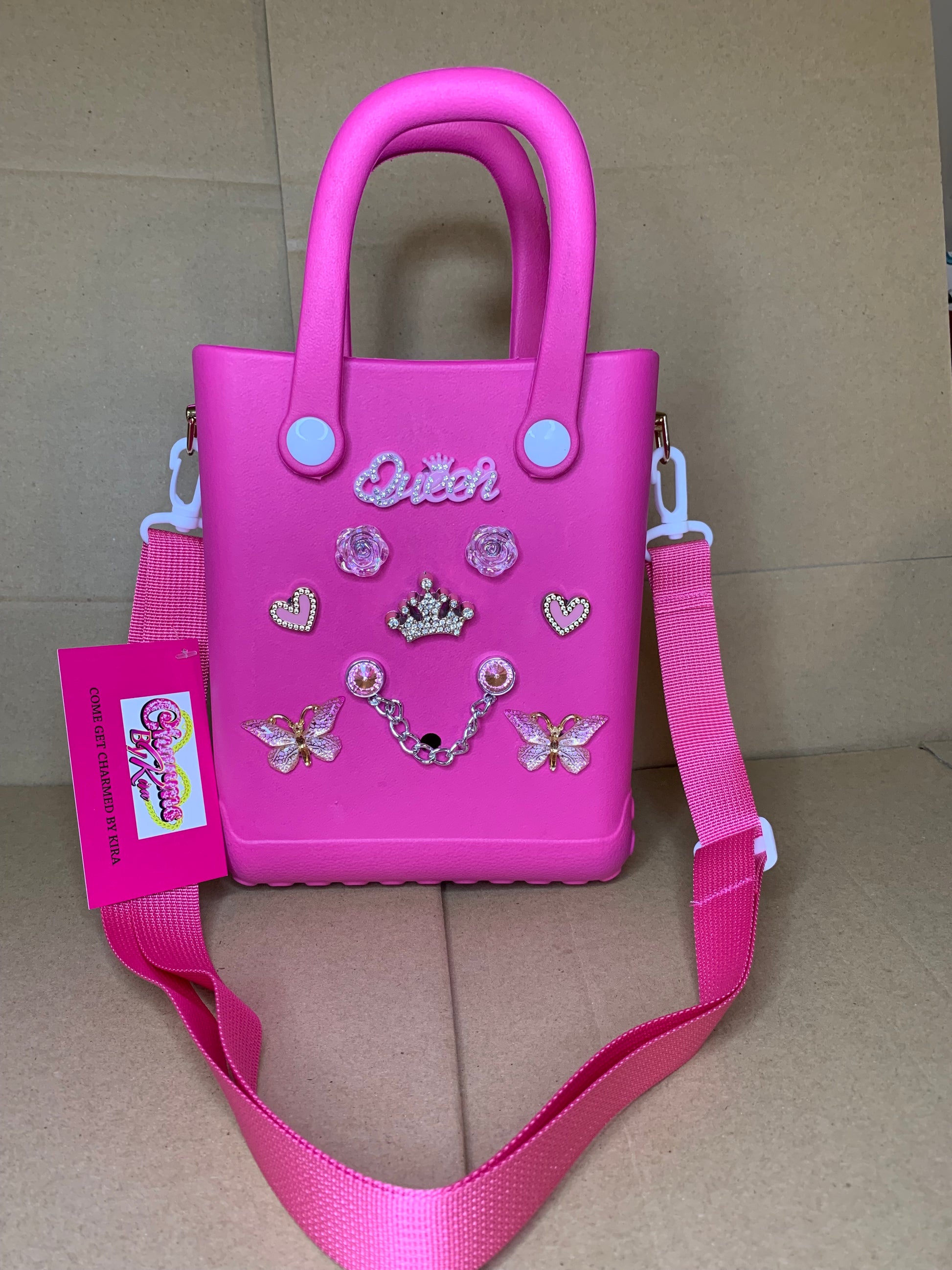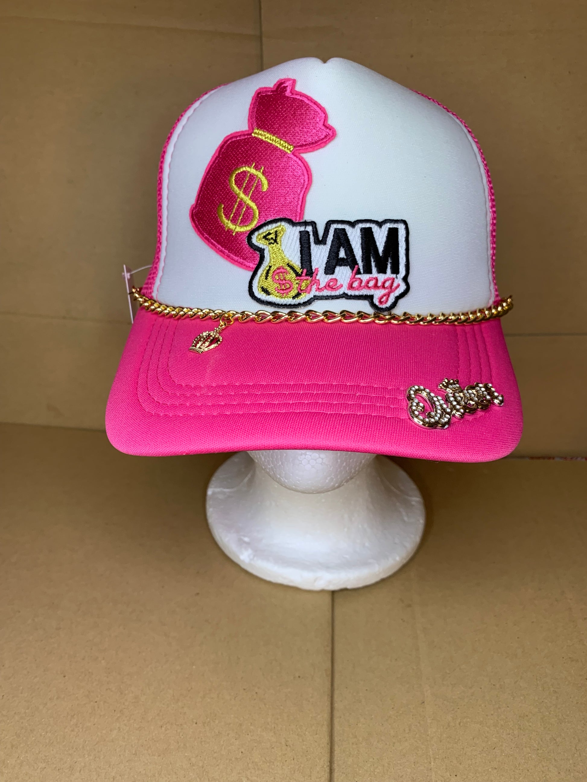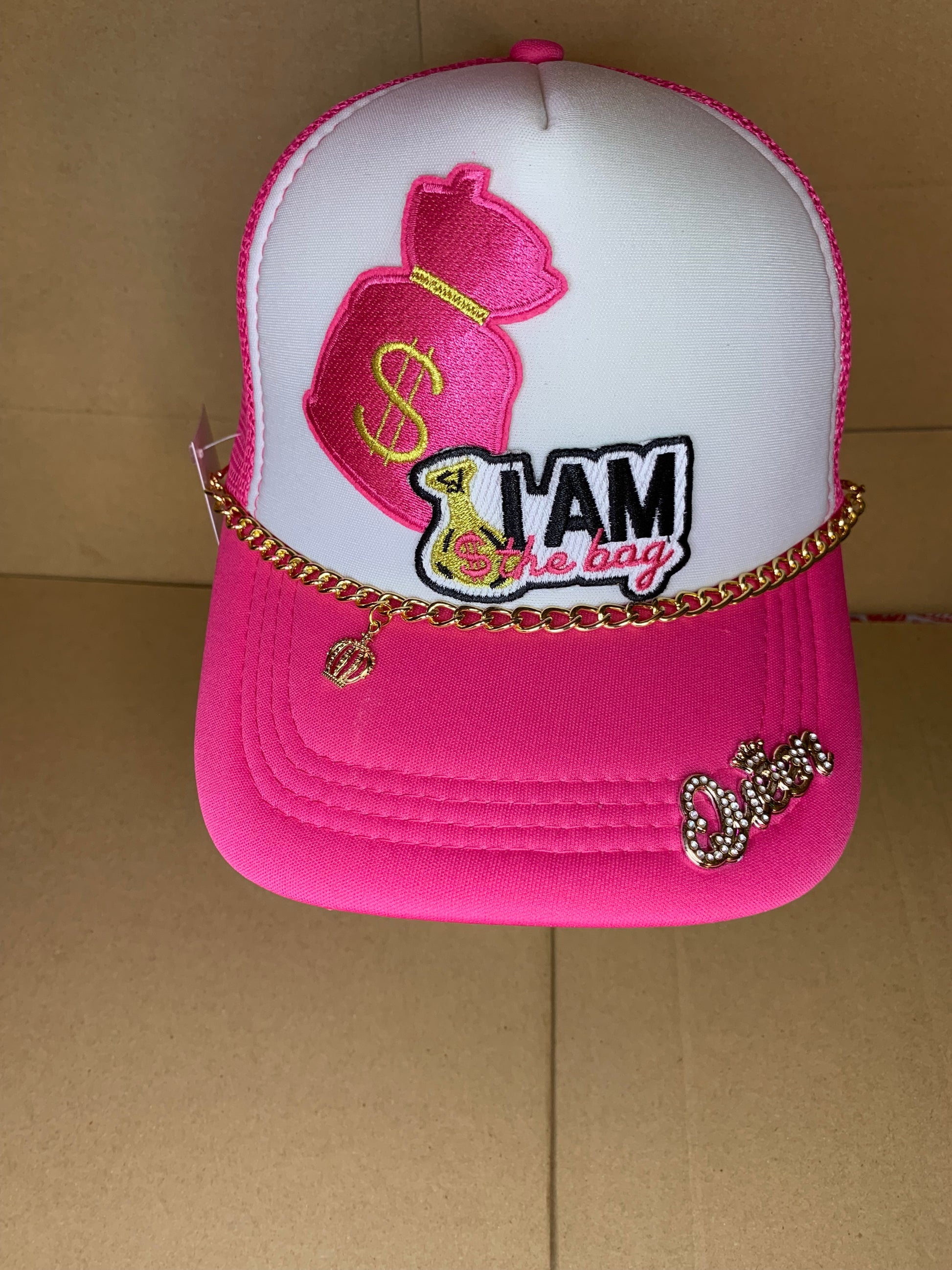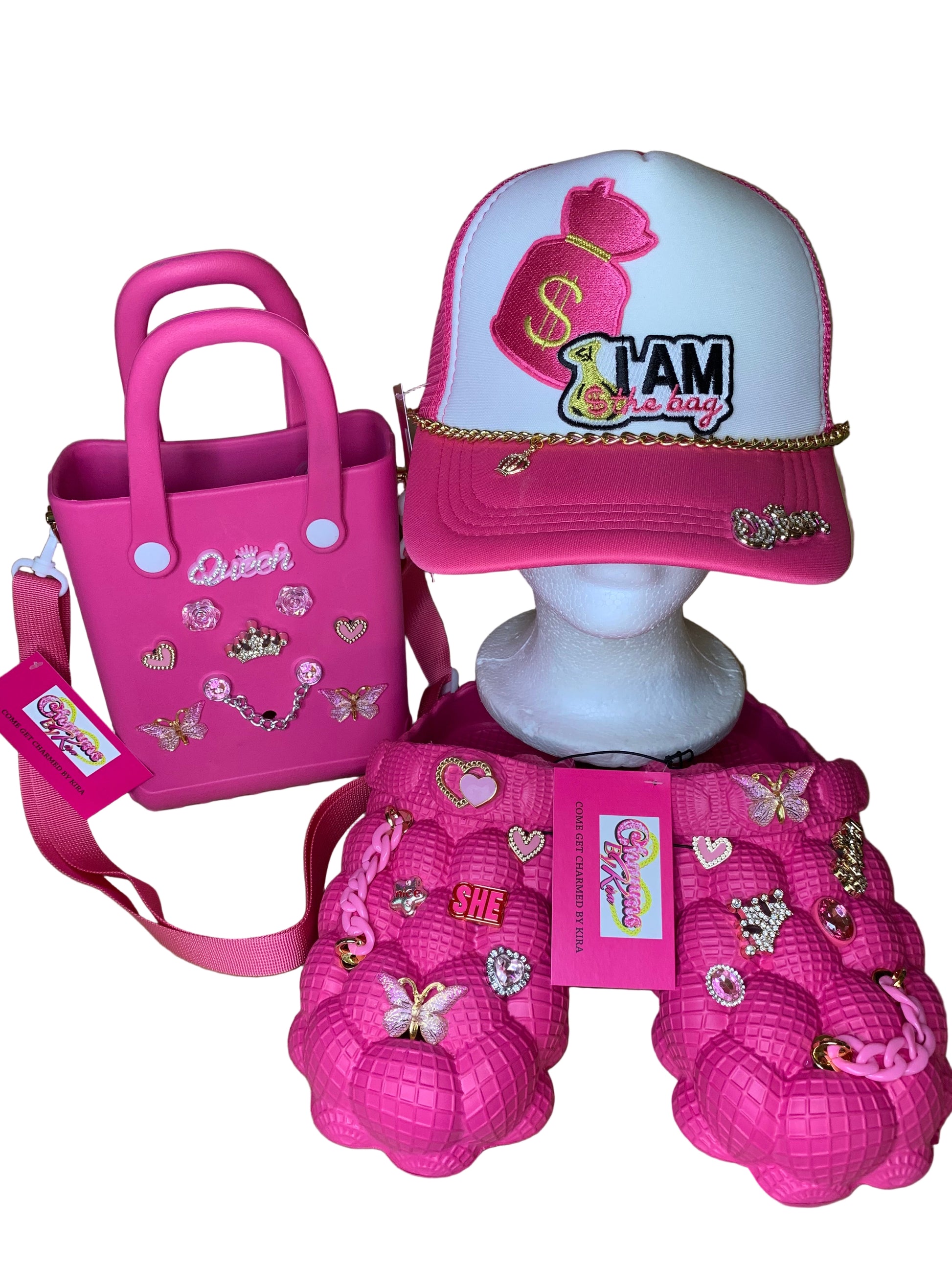 This set includes bubble slides size 9 with the strap to put in sports mode😂a trucker hat that’s adjustable with the SnapBack to fit most adults & young adults & a mini rubber bag💞