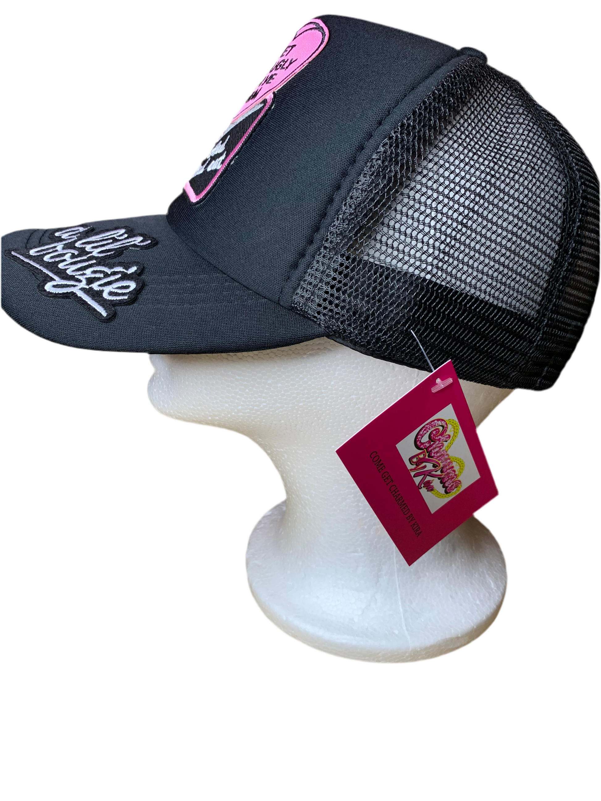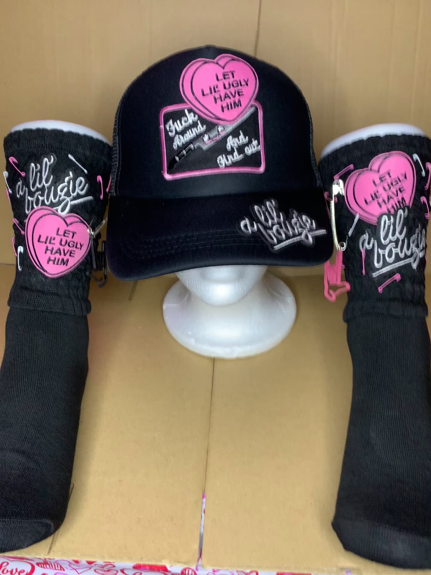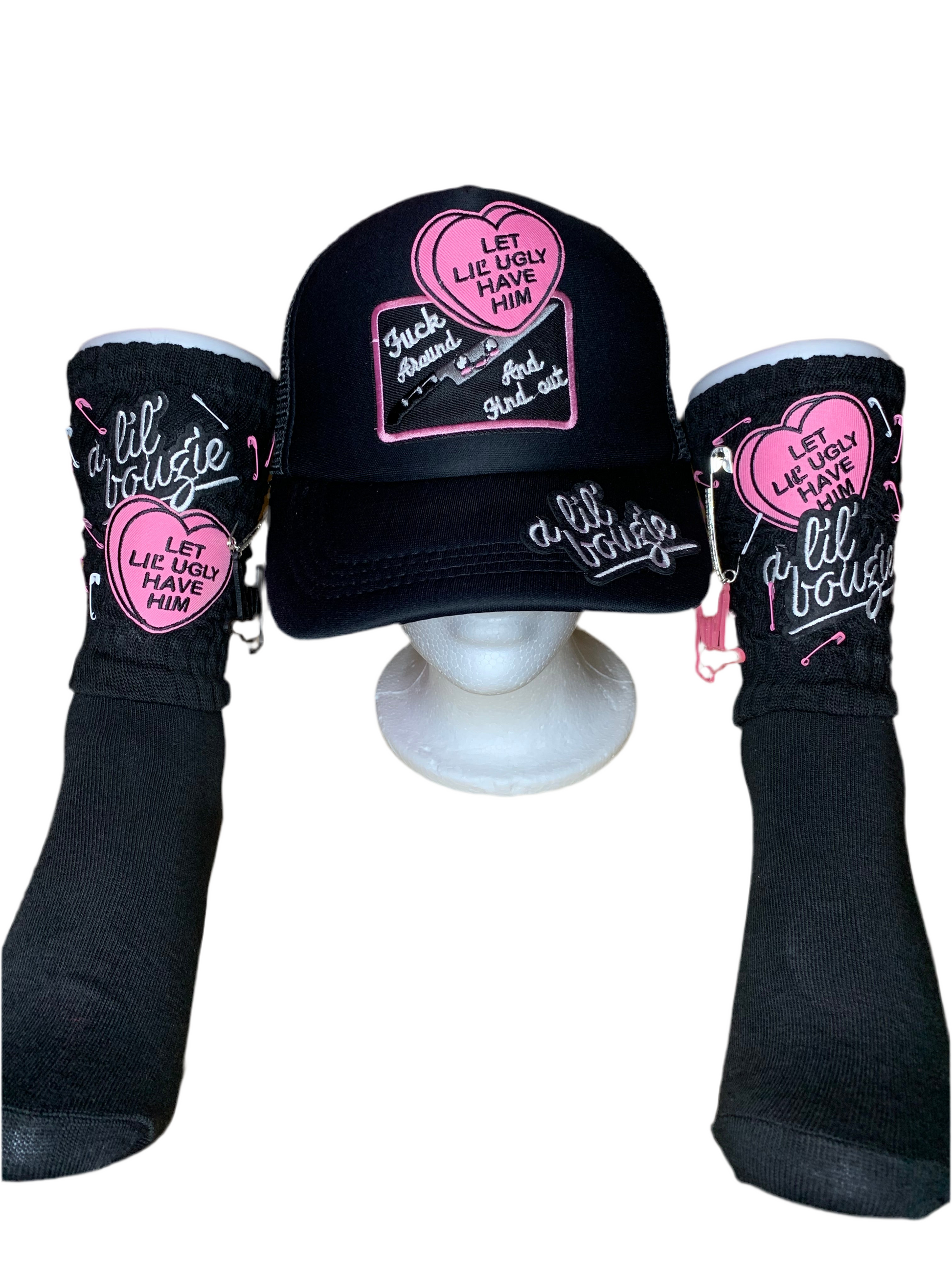 This cute set comes with a SnapBack trucker hat that’s adjustable to fit all & a pair of slouch socks size 6-9😘