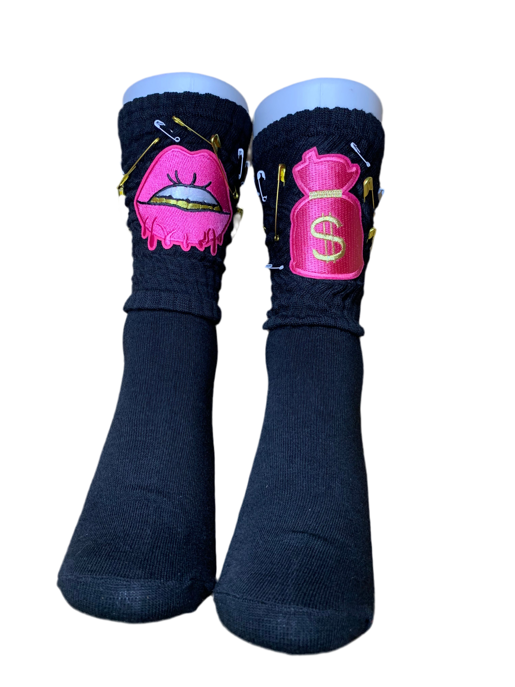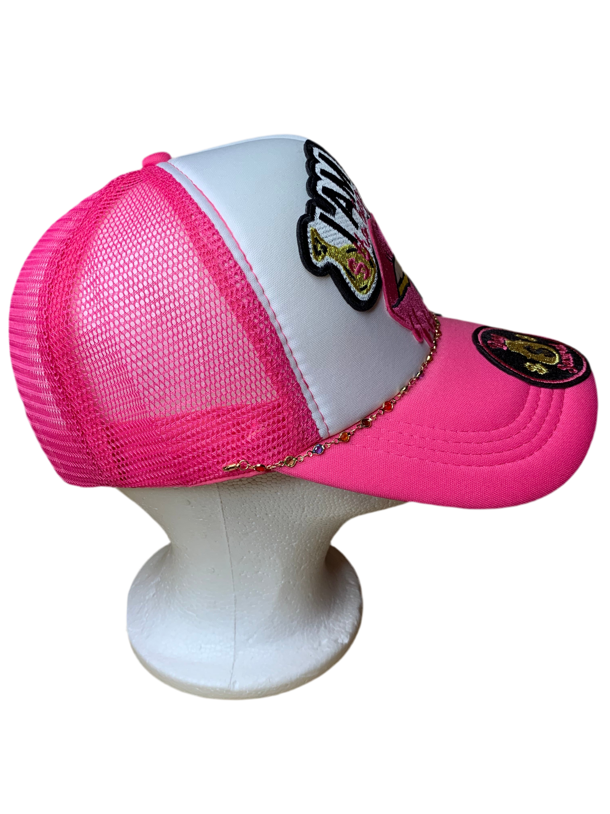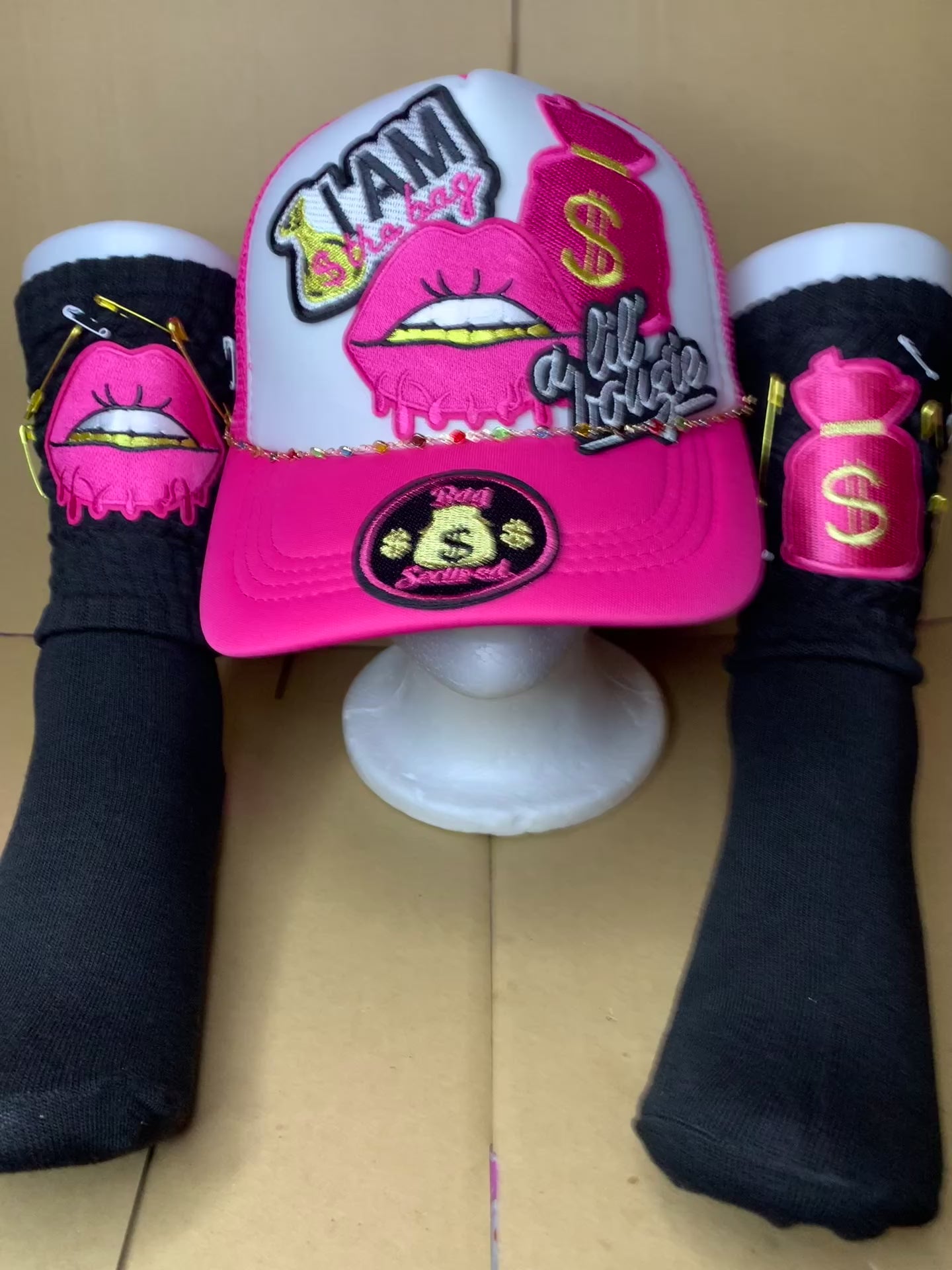 This pretty set comes with a SnapBack trucker hat that’s adjustable to fit most & it also comes with a detachable chain & a pair of slouch socks that’s a size 5-9😘
