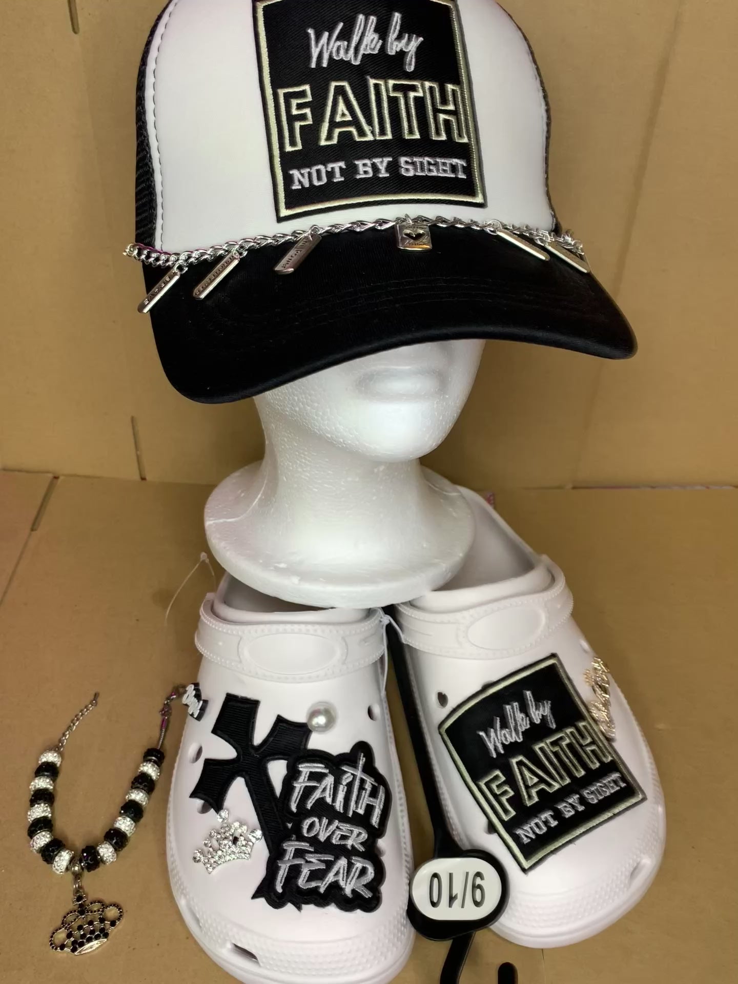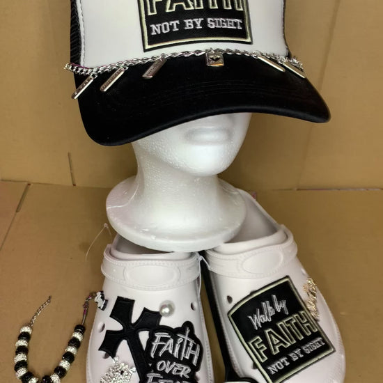 This pretty GODLY set comes with a SnapBack trucker hat thatās adjustable to fit all,a pair of clogs size 9/10 & a beaded bracletš