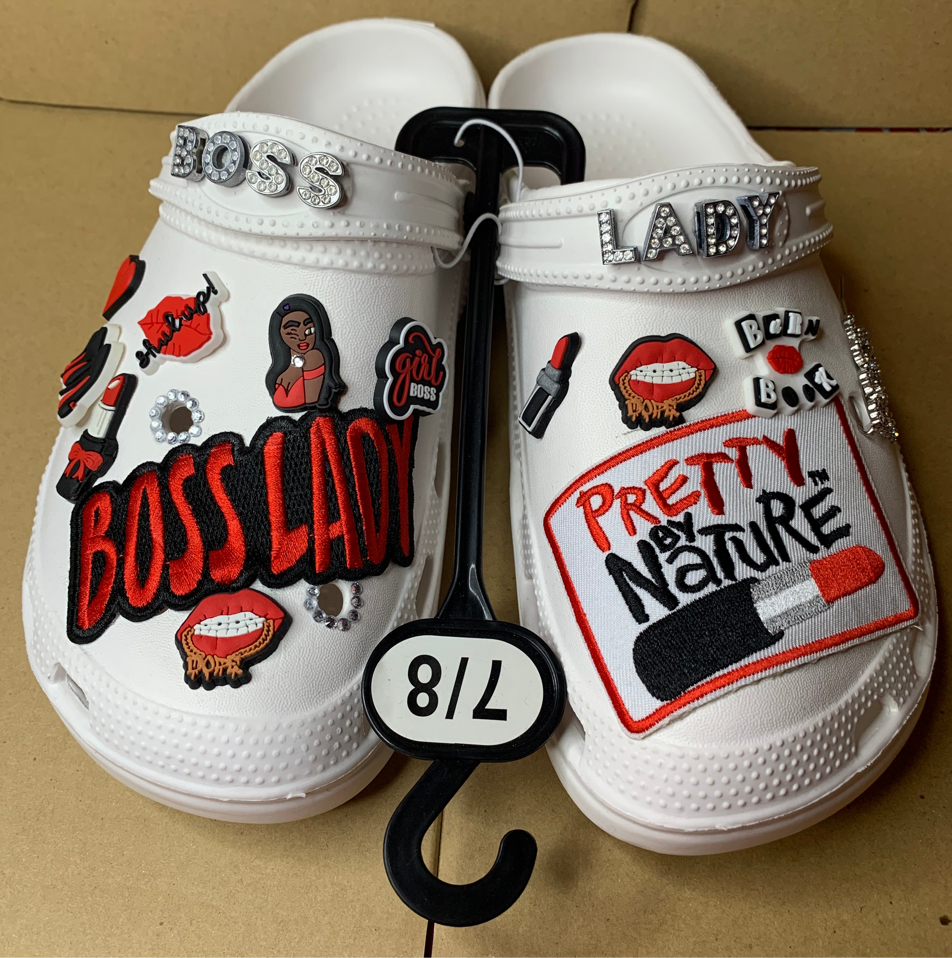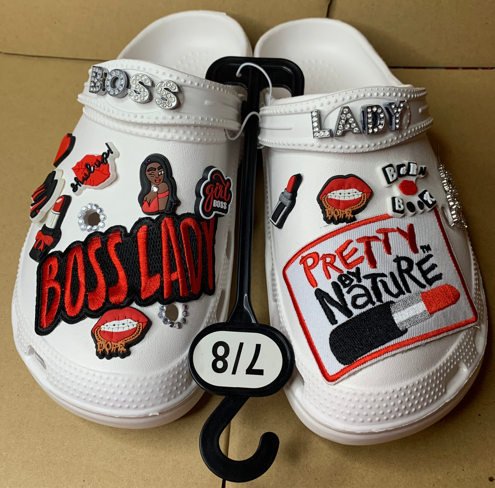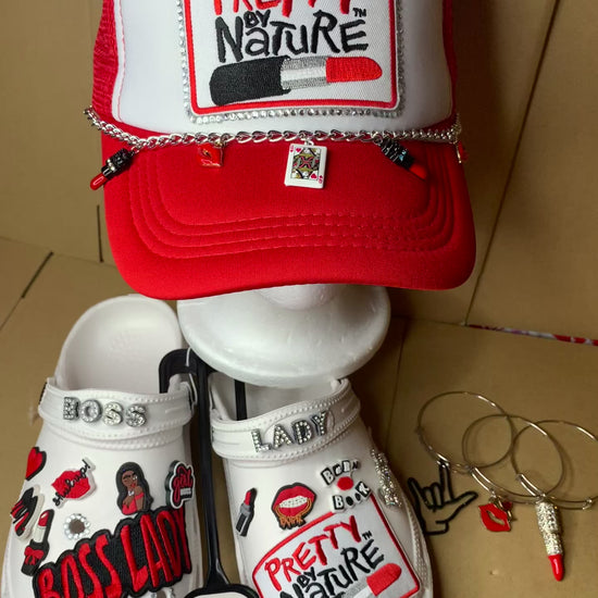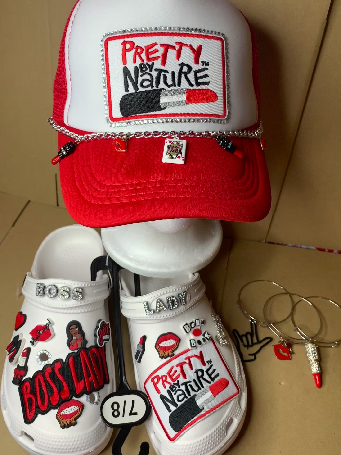 ❤️This pretty BOSS LADY set comes with a SnapBack trucker hat 🧢that’s adjustable to fit all adults & young adults with the SnapBack & clogs size 7/8 & 3 expandable charm bangles that fits most wrist❤️