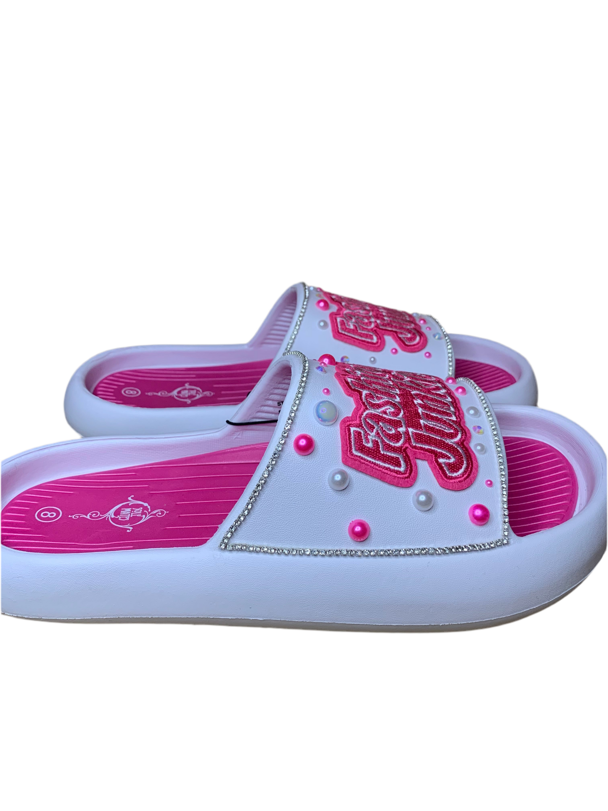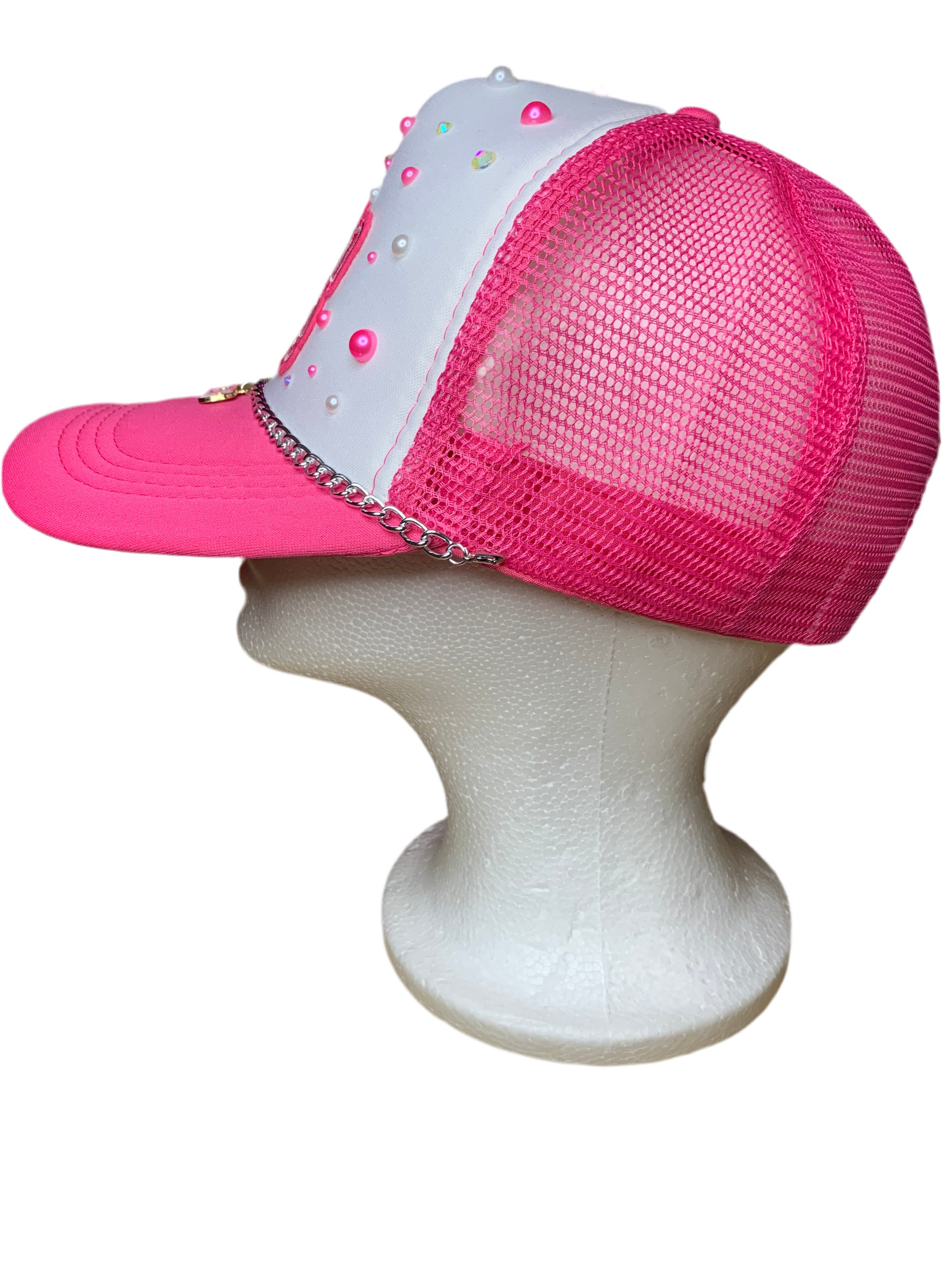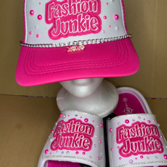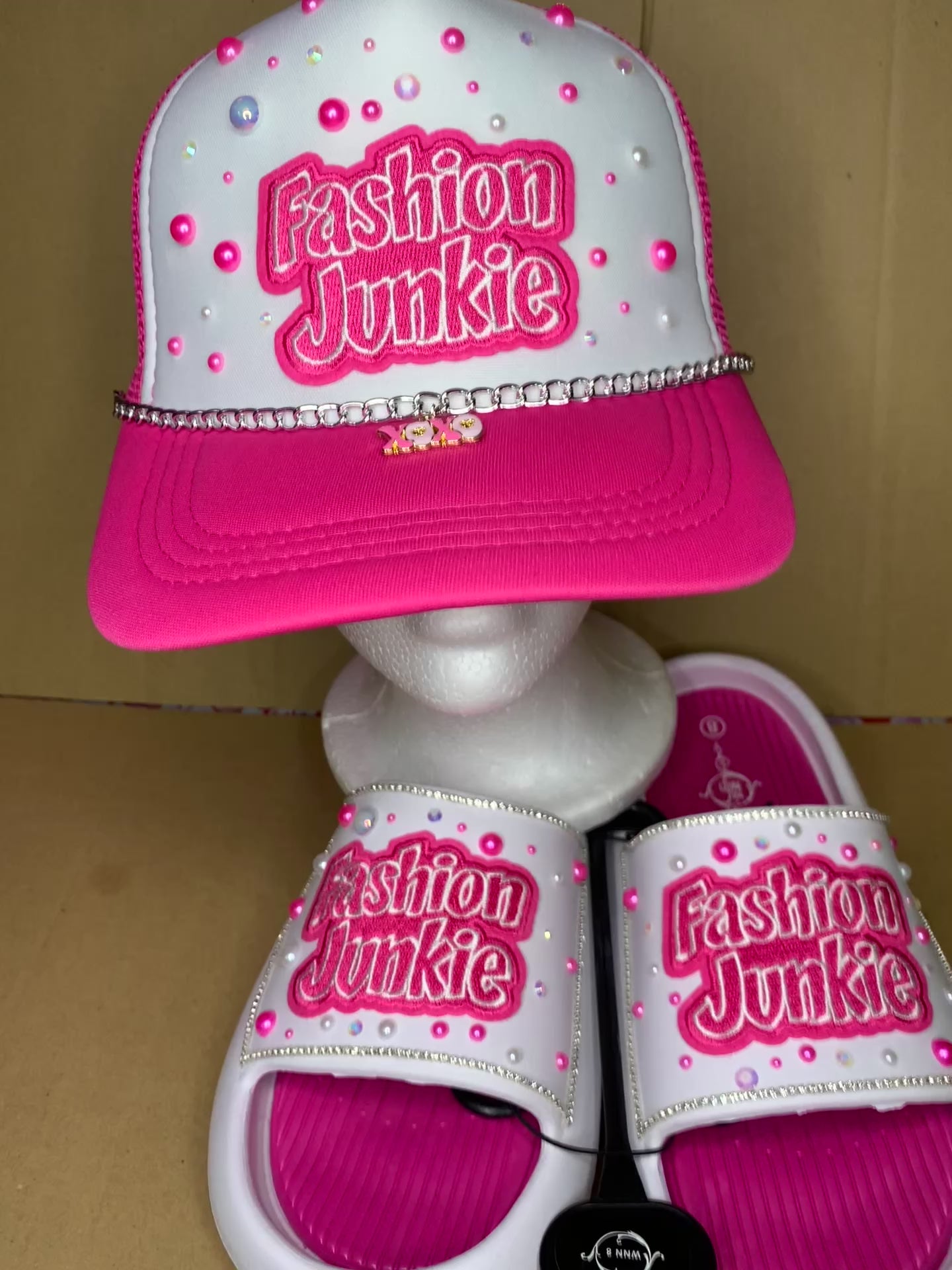 🩷🤍This pretty pink & white set comes with a SnapBack trucker hat that’s adjustable to fit all with the SnapBack & chunky slides size 8😘